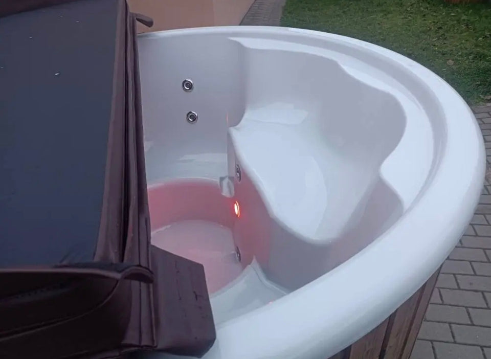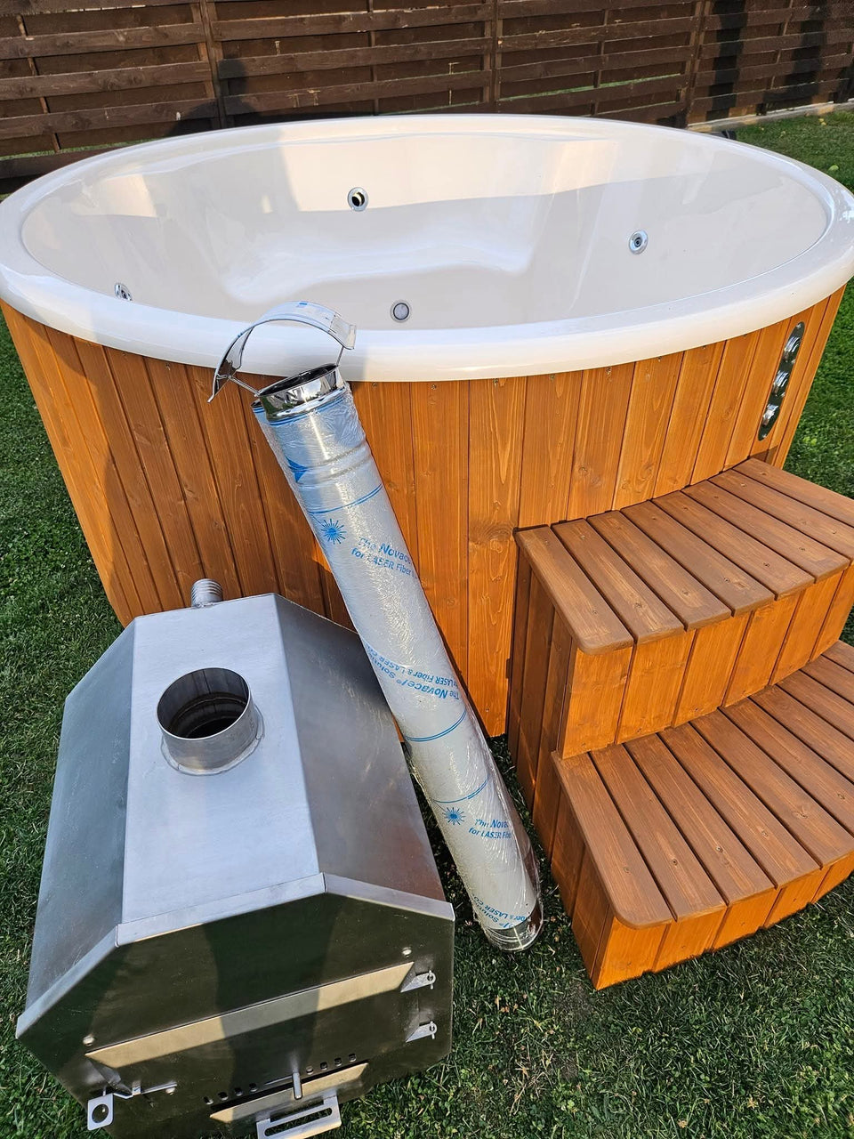 Het grootste verschil bij een geïntegreerde kachel is dat deze onder de glasvezelkuip is ingebouwd. Hierdoor bevat de kuip minder water en warmt het water sneller op. Daarnaast bespaart een hottub met geïntegreerde kachel ruimte in de tuin.